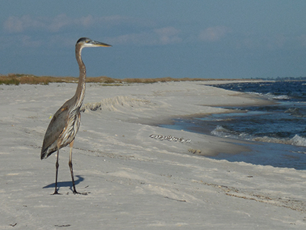 The next place I headed for was Perdido Key, just about as far west as one can go in Florida. There is a Florida State Park on the key, which is day use only, and then a campground on the mainland called Big Lagoon State Park, where I set up the camper. About half of Perdido Key is part of the Gulf Islands National Seashore. I could get in to that with my very cool National Parks pass, which I bought for the whole year. WRONG. With our totally dysfunctional government shutdown, they are all closed down. Even the websites, though for the life of me, why they needed to shut the websites down is beyond me. How expensive can that be? Maybe the government could make a few less bombs or drones and save a few bucks that way. Nawwwww. That might even make some sense. Health care? Weapons? Where are our priorities? What did Ike say? Beware of the Military Industrial Complex? And he a republican general! I’d better not go off on that topic. Anyway. This whole National seashore is closed and the gates are locked. I have my pass though. So I got the paddleboard and hiked it down to the beach and paddled across the intercoastal waterway – a half mile across or so, and landed on the key. It’s only a couple hundred yards wide, so I walked across to the gulf side and there it was, one of the most beautiful beaches I have ever seen. And there was nobody there. I had the whole beach to myself. Quite a change from Rehoboth Beach! It was awesome. I had the added excitement of the possibility of the ranger coming along and citing me. I went in for a swim and as I did, a great blue heron flew in and watched me swim. I got out slowly and this bird kept coming closer and closer – very interested in me. So we hung out together. I went up to get a little sun and this bird came with me. Very cool. It had the most amazing yellow eyes, not to mention the huge beak, which would put a hurtin’ on anything it wanted to. I’ve never been so close to one. By now the sun was getting low, so I got the board and paddled back to the campground. I landed in a different place than I put in from, and put the board on my head and started walking. And walking. And walking. Long story short, I missed my turn and must have walked for an hour with the board on my head, and it is heavy enough to be pretty uncomfortable. So now it’s almost dark, I have a bathing suit on and I’m lost. I finally made it back after dark and collapsed with a nice bourbon on the rocks, probably an inch shorter from hauling this thing on my head. (The reefer in the truck makes a fine ice cube.) It was a nice analogy of taking the good with the bad, just like life. If you didn’t have those bad times, you wouldn’t recognize the amazingly good things when they happened. So the government shutdown worked in my favor this time. Having a whole National Seashore to myself was a blessing.